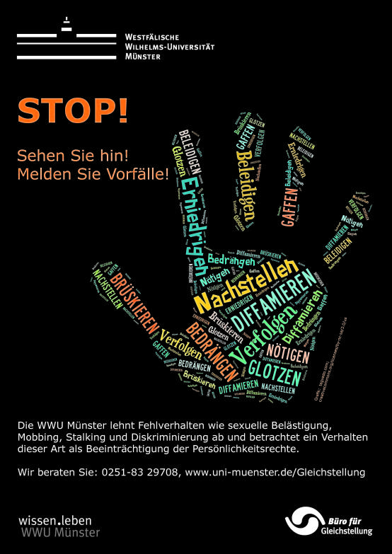 Die WWU positioniert sich im Rahmen der partnerschaftlichen Vereinbarung (PDF), die für alle Mitglieder der WWU gilt, ganz deutlich: Fehlverhalten wie sexuelle Belästigung, Mobbing, Stalking und Diskriminierung wird vehement abgelehnt und als Beeinträchtigung der Persönlichkeitsrechte betrachtet. Ziel ist es, ein menschenwürdiges und intaktes Arbeits- und Studienklima sicherzustellen. Sollte ein solches Fehlverhalten auftreten, so ist unsere Botschaft: Sehen Sie hin! Melden Sie Vorfälle!