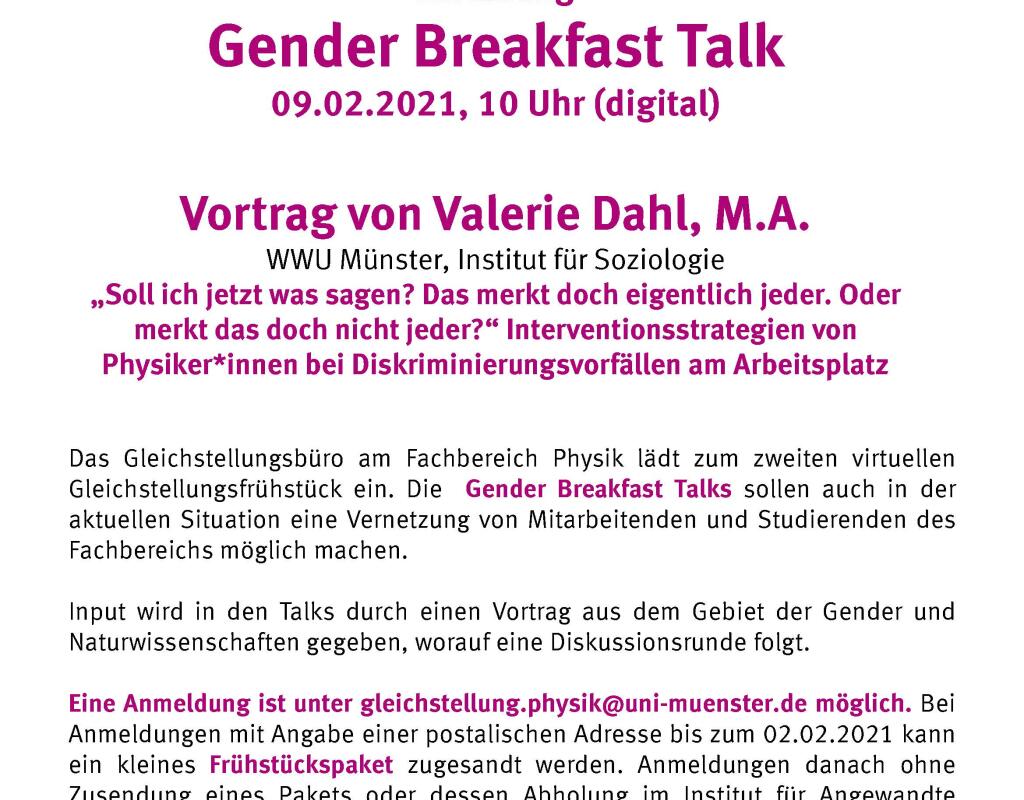 Das Gleichstellungsbüro am Fachbereich Physik lädt regelmäßig zum Gender Breakfast Talk ein. Eingeladen sind alle Angehörigen der WWU. Input wird in den Talks durch einen Vortrag aus dem Gebiet der Gender- und Naturwissenschaften gegeben, worauf eine Diskussionsrunde folgt.