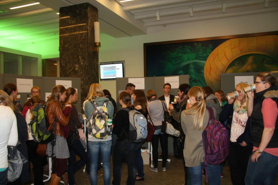 Am 22. April 2015 hieß es wieder "Mehr Frauen in die Wissenschaft - Promovieren geht über Studieren?" Bereits zum vierten Mal hatte das Gleichstellungsbüro alle Studentinnen, die kurz vor dem Abschluss stehen, zu einer Infoveranstaltung rund um das Thema Promotion eingeladen. Über 60 Studentinnen folgten dieser Einladung und nutzten die Gelegenheit, um ihre Fragen zu klären und somit der Entscheidung pro oder contra Promotion näher zu kommen. Neben Vorträgen zur Promotion an der WWU (Dr. Jan Schmidt, Graduate Centre), zu den Karrierechancen mit und ohne Promotion (Andreas Eimer, Career Service) und zur Finanzierung (Linda Dieks, Safir) konnten sich die Teilnehmerinnen im Stehcafé ausführlich zum Thema Promotion beraten lassen. Abgerundet wurde das Angebot durch eine Podiumsdiskussion zum Thema "Promotion - so war/ist das bei mir!", bei der promovierte und promovierende Wissenschaftlerinnen den interessierten Studentinnen im Publikum Rede und Antwort standen. Das Programm des Nachmittages finden Sie