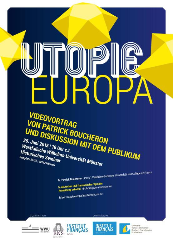 Die Veranstaltungsreihe „La jeune génération des médiévistes français invitée à Münster – Junge französische Mediävisten zu Gast in Münster" und das Interdisziplinäre Frankreich-Forum (iff) an der Westfälischen Wilhelms-Universität werden Ausrichter eines Videovortrags mit anschließender Diskussion sein, die Teil der von Institut français Deutschland organisierten Reihe „Une certaine idée de l’Europe‟ ist. Ziel der Veranstaltungsreihe ist es, angeregt durch Vorträge renommierter Vertreter wissenschaftlicher und gesellschaftlicher Felder, gemeinsam über Europa zu diskutieren.