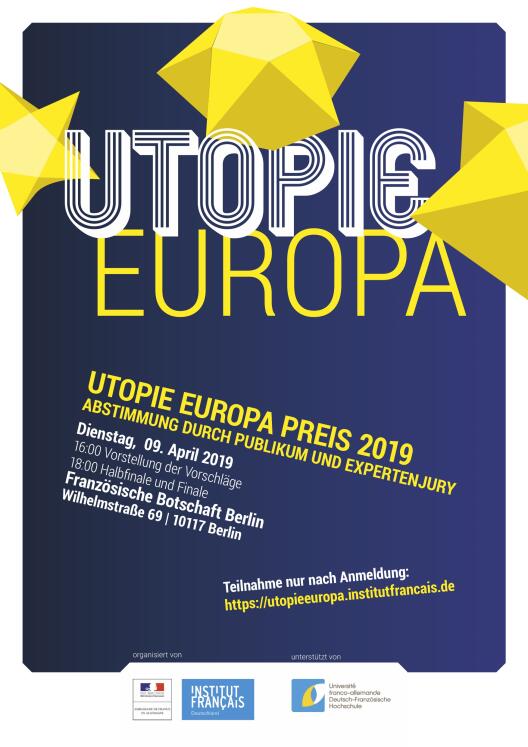 Noah Brunn, Jan Philipp Fredebeul, Eva Marie Janke, Thomas Peter Lorkowski unter Begleitung von Dr. Nils Bock folgen der Einladung der Französichen Botschaft und werden im Rahmen des Debattierwettbewerbs "Utopie Europa" ihre Gedanken für konkrete Zukunftsvorschläge für Europa vorstellen und gegen acht weitere Studierendegruppe verteidigen. Das Publikum und eine Expertenjury stimmen über den besten Vorschlag ab, der mit dem „Utopie Europa Preis 2019“ ausgezeichnet wird.