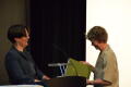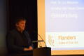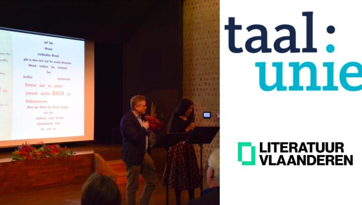 Op vrijdag 26 september 2025 vond bij het afscheid van Prof. dr. Lut Missine een schrijversbezoek plaats in de Studiobühne in Münster, dat mede mogelijk werd gemaakt door de Taalunie. Het schrijversbezoek, dat werd bijgewoond door collega’s, studenten, alumni, vrienden en verwanten van Lut Missine, betrof auteur Matthijs De Ridder en vertaalster Anna Eble, oud-studente aan het instituut. Matthijs de Ridder is een in België werkzame, Nederlandse auteur, literair recensent, docent en musicus. Sinds 2009 zet hij zich samen met het Paul van Ostaijengenootschap in voor de studie en de promotie van het werk van Paul van Ostaijens lyriek. Matthijs en Anna verrasten dan ook met een expressieve duovoordracht van Paul Van Ostaijens literaire werk. Met Bumm Paukenschlag! droegen ze een selectie van gedichten met Duitse vertalingen en ondersteund met beeldmateriaal voor, dat zowel bij de Nederlandstalige als de Duitstalige deelnemers een diepe indruk achterliet. Door het afwisselend voordragen van de lyriek in twee talen werd de universele kracht van het woord duidelijk en hoe taal bruggen kan slaan tussen twee culturen. Vele aanwezige studenten hadden in de colleges van Prof. Missinne het werk van Paul van Ostaijen al leren kennen en zagen zijn literatuur op indrukwekkende wijze tot leven komen. Voor De Ridder zelf was het schrijversbezoek een uitstekende mogelijkheid om zijn grootschalige literaire projecten over van Ostaijen, die onder meer uiting vond in de biografie Paul van Ostaijen. De dichter die de wereld wilde veranderen (2023) en Boem Paukeslag (2021), onder de aandacht te brengen van neerlandici. Het INP en alle betrokkenen bedanken de Taalunie voor het mogelijk maken van het schrijversbezoek.