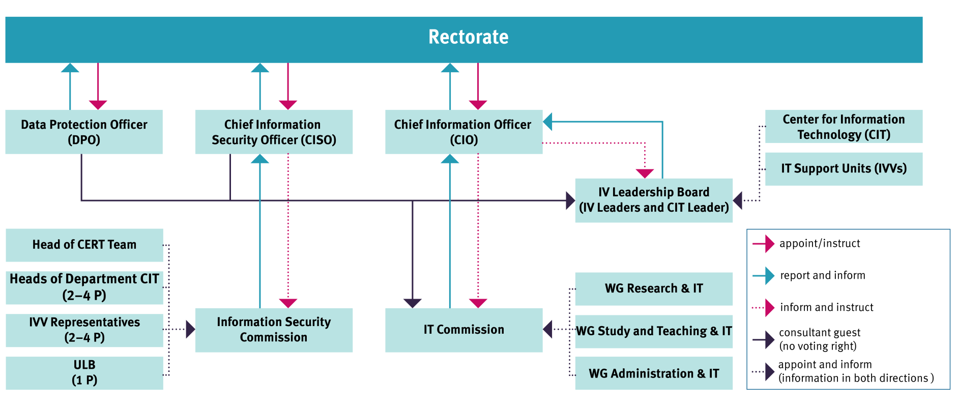 The Rectorate decides on IT measures of particular importance. It can also award contracts directly to the providers. The Rectorate appoints representatives (CIO, CISO, DPO), who advise them and check the implementation of the decided measures as well as compliance with legal requirements by the providers. The Chief Information Officer (CIO) connects the providers and the decision-making bodies. The Information Security Commission performs inspection functions in the area of IT security. The Data Protection Officer (DPO) works closely with the Information Security Commission to ensure that data protection is maintained at the University of Münster.