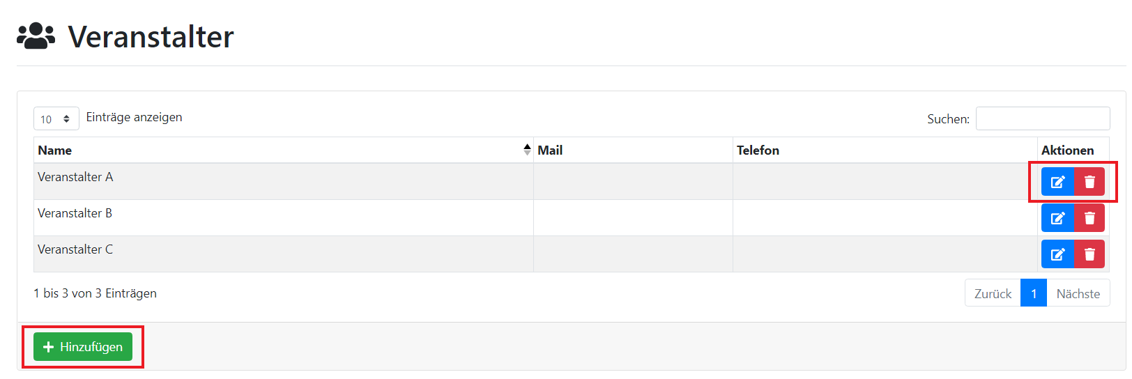 Please always check first whether the organizer already exists in the list before you create a new one. If possible, enter an organizational unit as the organizer. Individual persons can then be added under "Contact person".