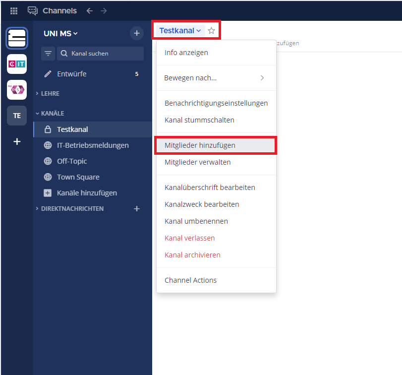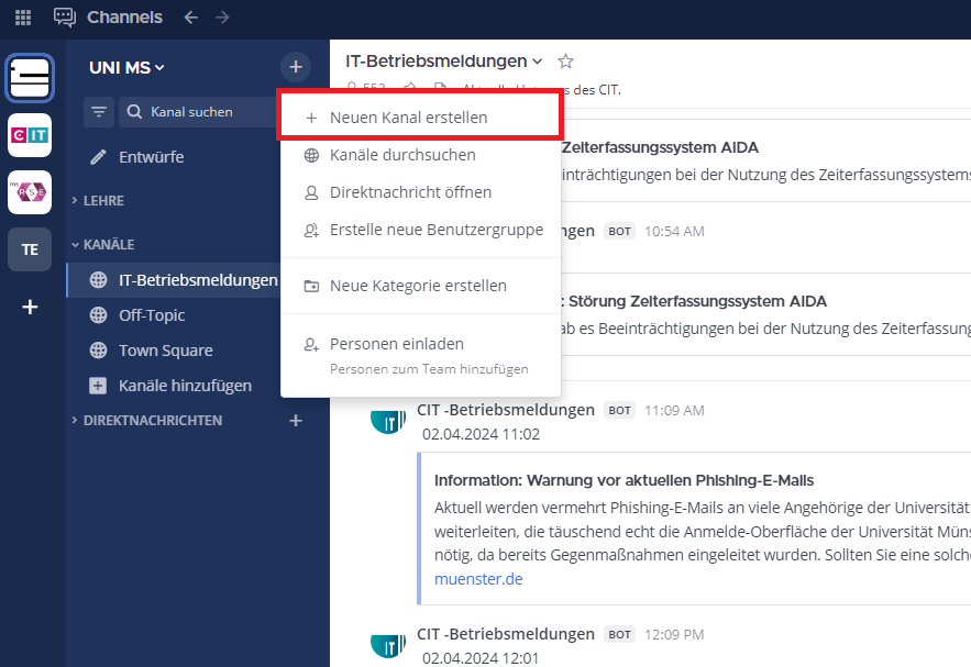 A Mattermost channel is an organizational unit subordinate to a team, such as a working group. Channels can be private and public. If the latter is the case, anyone can see the channel and join without an invitation.