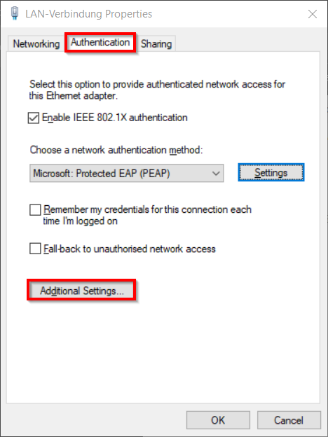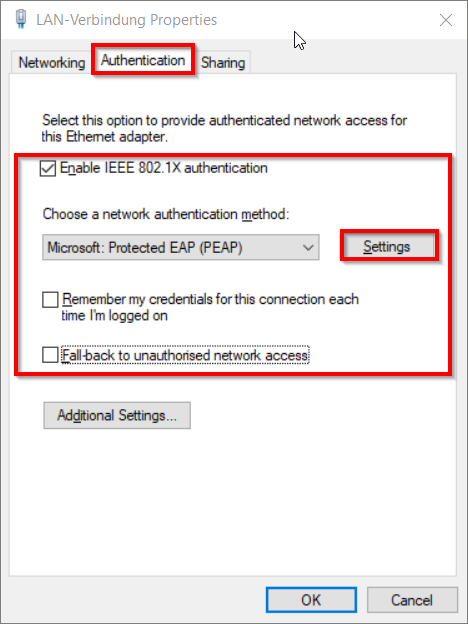 - Network authentication method: Microsoft: Protected EAP (PEAP)