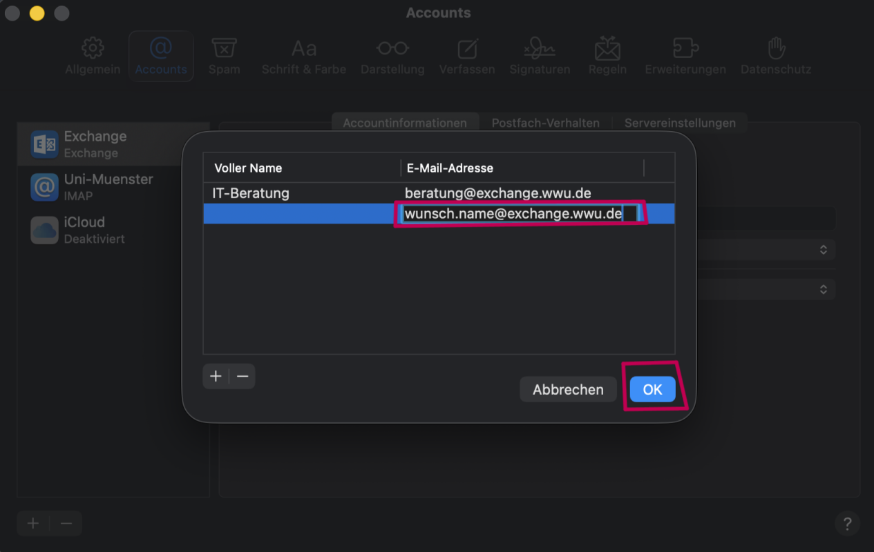 E-Mail-Wunschnamen hinzu, den Sie zuvor im IT-Portal gesetzt haben.