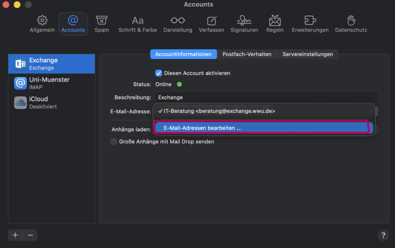 Sie sollten die Exchange-Adresse nicht als Kontaktadresse verwenden, sondern immer die Standard-E-Mail-Adresse ( Kennung@UNI-MUENSTER.DE ) angeben.
