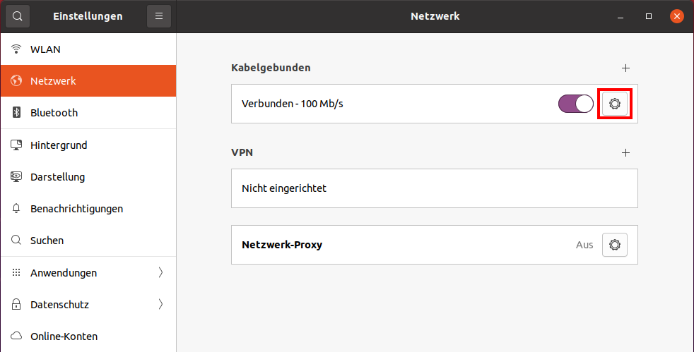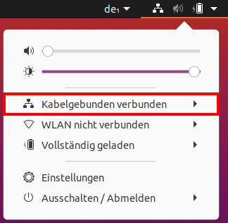 Vor der ersten Nutzung von pLANet.X muss Ihr PC konfiguriert werden. Öffnen Sie das Statusmenü in der oberen rechten Ecke und wählen Sie den Eintrag "Kabelgebunden verbunden". Anschließend wählen Sie "LAN-Einstellungen". Im folgenden Fenster fügen Sie unter "Kabelgebunden" ein neues Profil hinzu.