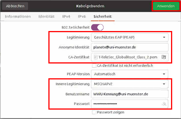 - CA-Zertifikat: rooca.cer oder T-TeleSec GlobalRoot Class 2 (ggf. zuvor installieren, ansonsten zu finden unter dem Systempfad file:///etc/ssl/certs/T-TeleSec_GlobalRoot_Class_2.pem)