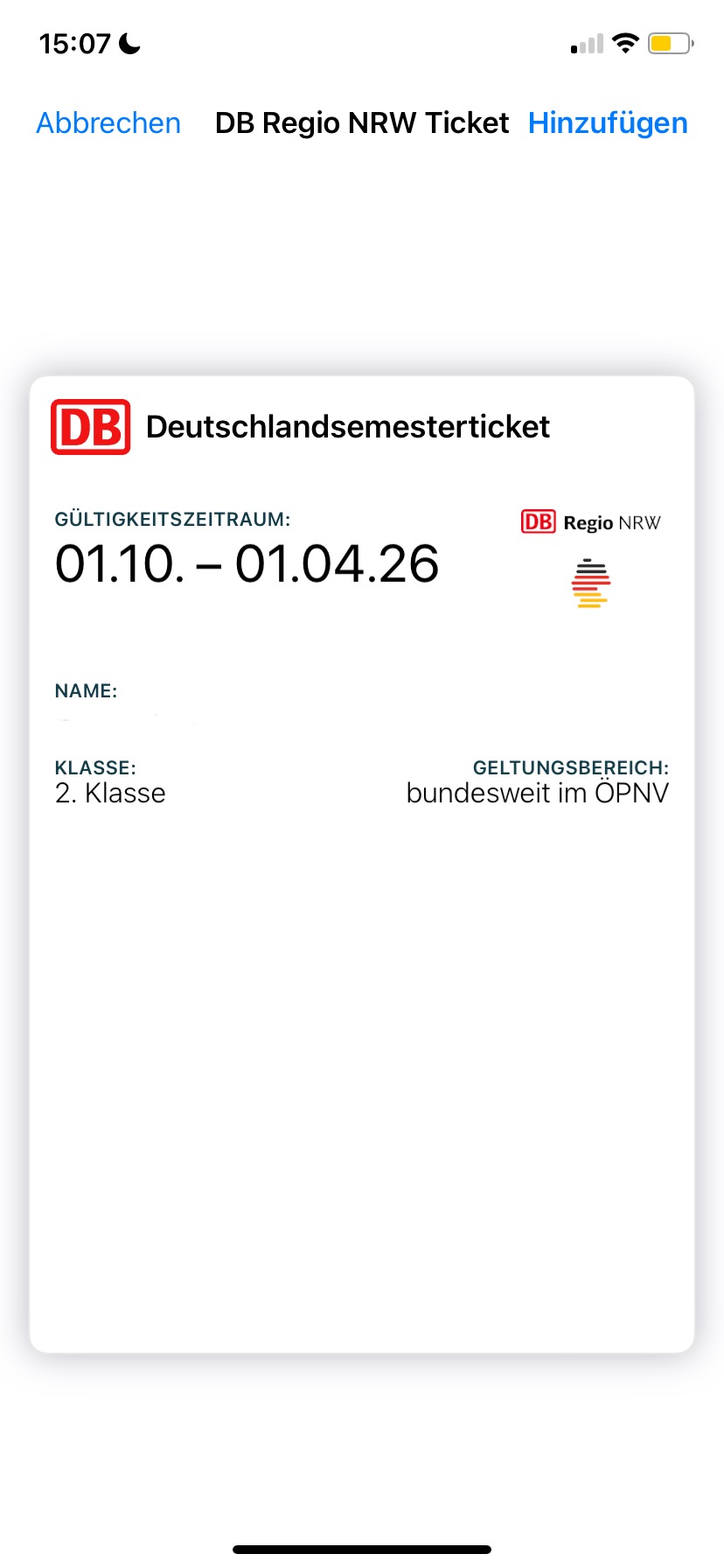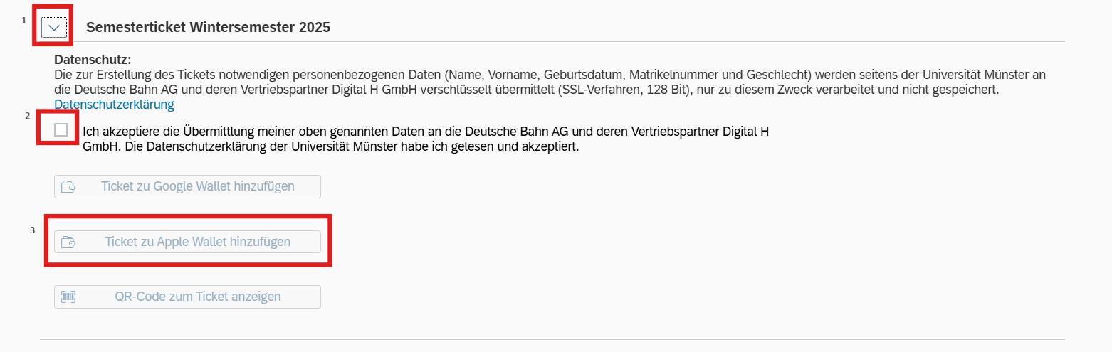 Im SelfService wählen Sie die Kachel "Semestertickets" aus. Dort scrollen Sie dann herunter und klicken auf den Pfeil neben "Semesterticket". Nachdem Sie der Datenübermittlung an die Deutsche Bahn AG zugestimmt haben können Sie fortfahren und "Ticket zu Apple Wallet hinzufügen" auswählen.