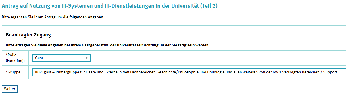 Zusätzlich zu dem gewöhnlichen Antrag, finden Sie auch eine Anleitung, wie ein Gast Zugriff auf ein Mail-Postfach und einen Domänen-Account bekommt.