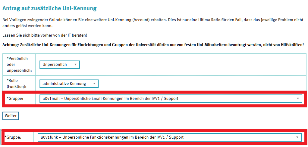Die beantragende Person sollte fest bei der Universität eingestellt sein (keine SHK), da die Kennung dauerhaft an die Person gebunden ist, aber später übertragen werden kann. Zudem kann das OTP (One-Time-Password) nur durch die Person, die die Kennung besitzt, im eigenen IT-Portal gesetzt werden.