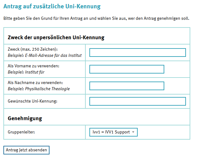 Auf der nächsten Seite müssen Sie den Zweck der Kennung erläutern und eine Angabe für Vor- und Nachname machen. Da es sich um eine unpersönliche Kennung handelt, sollen Sie natürlich nicht Ihren Vor- und Nachnamen angeben. Orientieren Sie sich stattdessen an dem im Formular angegebenen Beispiel (Vorname: Institut für, Nachname: Physikalische Theologie). Außerdem können Sie sich eine Uni-Kennung wünschen. Aus der Kennung sollte aber Ihre Funktion einigermaßen erkennbar sein.