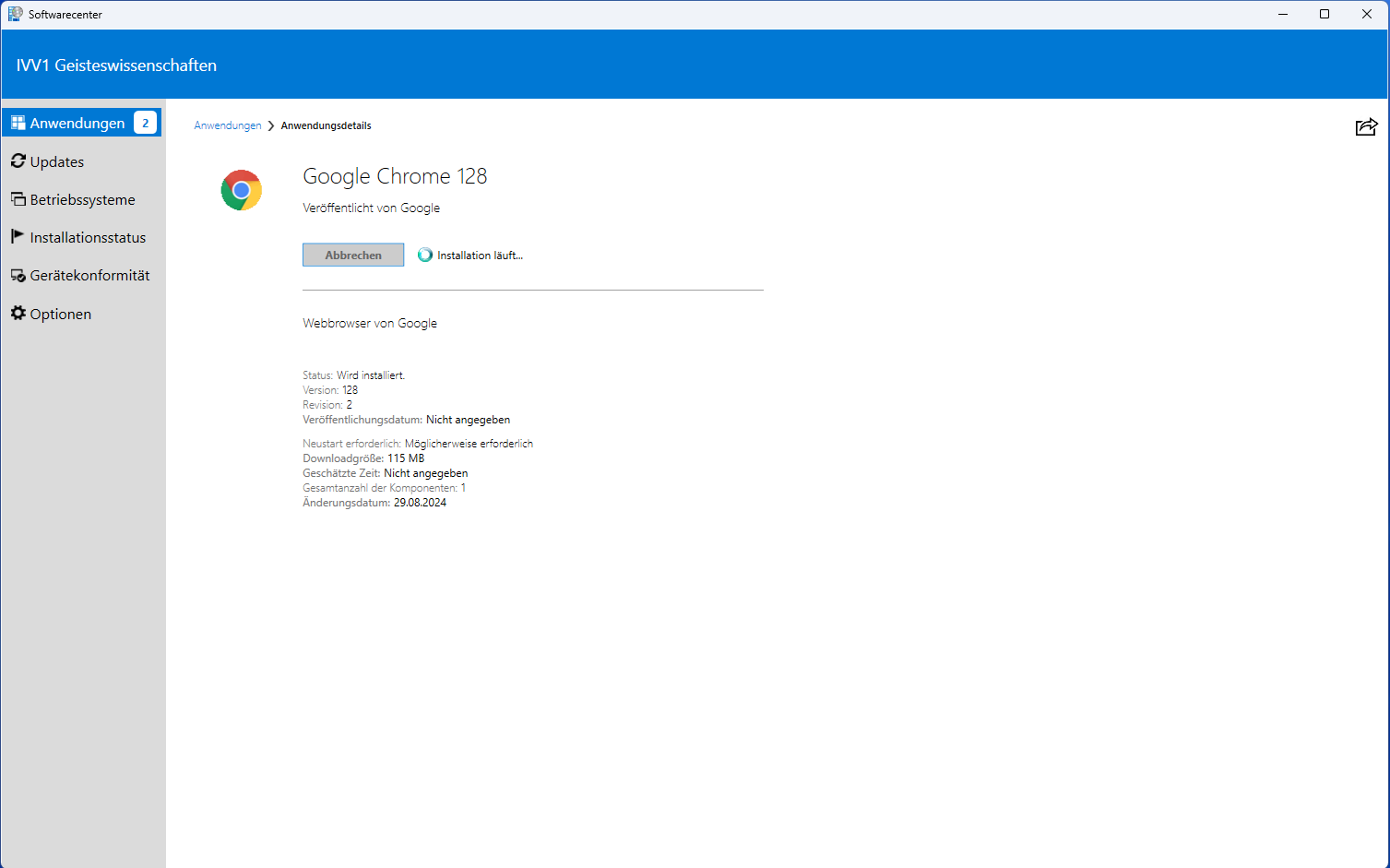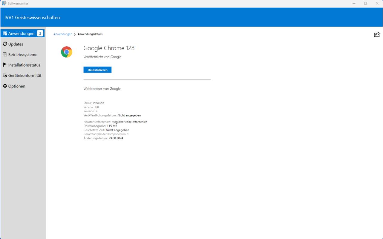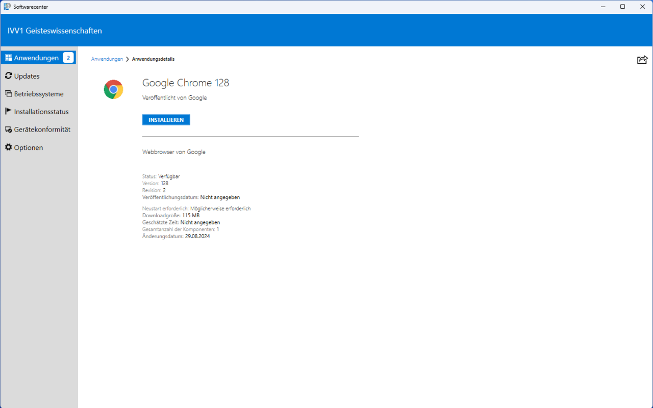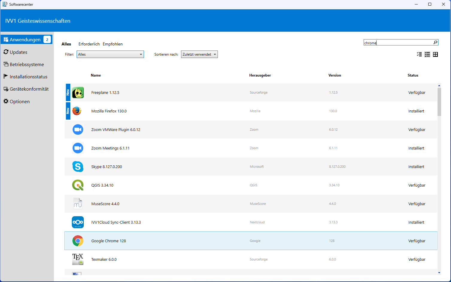 Unter „Anwendungen“ finden Sie alle Programme, die von der IVV1 zentral verteilt werden. Falls Sie einen Sonderfall haben und die benötigte Software nicht auffindbar ist, melden Sie sich per E-Mail oder Telefon bei uns, um eine Lösung zu finden. Wählen Sie das Programm aus, das Sie benötigen.