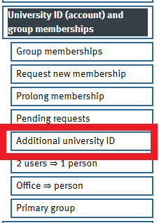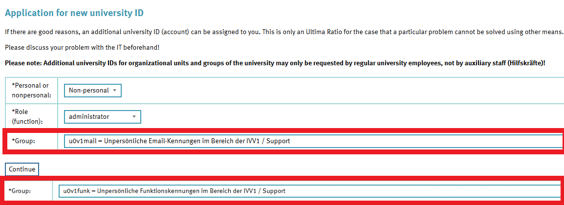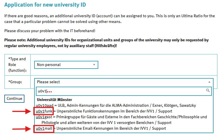 For a function ID, select the group u0v1funk = Unpersönliche Funktionskennungen im Bereich der IVV1 / Support.