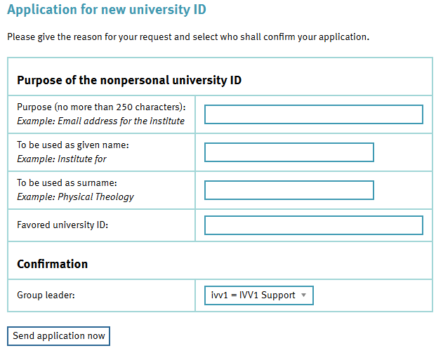 On the next page, you must explain the purpose of the identifier and enter your first name and surname. As this is an impersonal identifier, you should of course not enter your first name and surname. Instead, use the example given in the form as a guide (first name: Institute of, last name: Physical Theology). You can also request a university identifier. However, your function should be reasonably recognizable from the identifier.