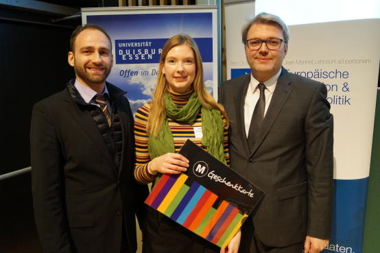 [21.01.2016] Braucht Europa eine gemeinsame Sozialpolitik? Sind die deutschen Bundesländer mehr als willige Strukturhilfeempfänger? Was sollte die EU aus der Eurokrise lernen? Solche und ähnliche Fragen diskutierten Studierende von fünf politikwissenschaftlichen Instituten in den vergangenen Monaten auf Einladung des NRW-Europaministeriums und schulten dabei ihre Debattierfähigkeiten. Am vergangenen Donnerstag (21.01.) trafen sich die Teilnehmerinnen und Teilnehmer zu einem Debattierwettbewerb unter Schirmherrschaft von Staatssekretär Marc Jan Eumann an der Universität Duisburg-Essen. Das Team des IfPols war dabei besonders erfolgreich: Masterstudentin Anne Stock wurde mit dem Preis für den besten Debattenbeitrag des Nachmittags ausgezeichnet. Sie hatte die Jury mit ihrer Argumentation gegen eine stärkere Vergemeinschaftung europäischer Sozialpolitik überzeugt. Im Teamwettbewerb belegte die Münsteraner Gruppe unter Leitung von Dr. Matthias Freise den zweiten Platz.