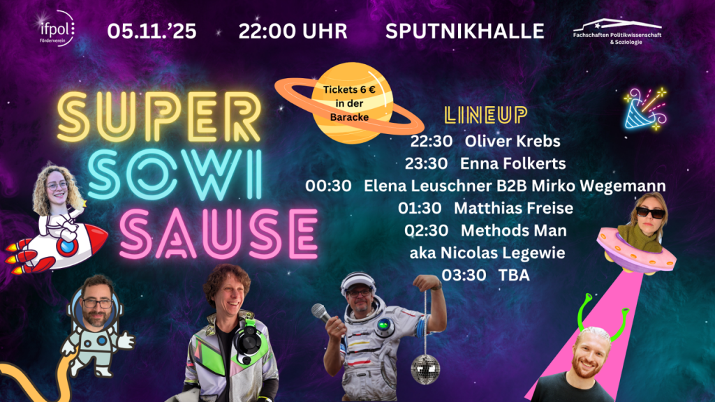 Bald ist es so weit: die SuperSowiSause steht vor der Tür! Am Mittwoch, den 05. November ab 22:00 Uhr lädt der IfPol Förderverein ein zur Party des Jahres in der Sputnikhalle, Am Hawerkamp 31. Das Besondere: An den Turntables stehen keine gewöhnlichen DJs, sondern Lehrende der Institute für Politikwissenschaft und Soziologie.
