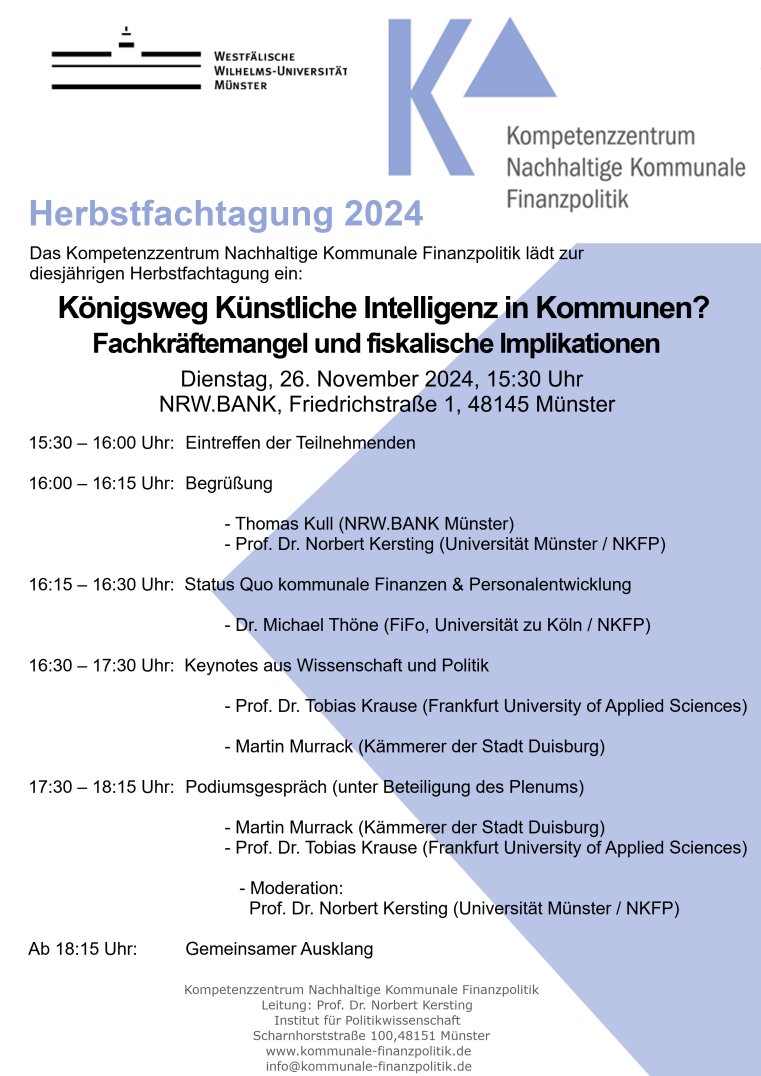 Auch im Herbst 2017 ist das Kompetenzzentrum „Nachhaltige Kommunale Finanzpolitik“ der Universität Münster wieder zusammen getreten und hat seine Herbstfachtagung veranstaltet.