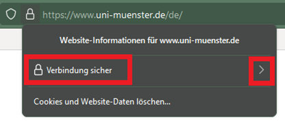 - An der Domain (z. B. "uni-muenster.de" oder "wwu.de") können Sie erkennen, ob es sich um die legitime Version einer Webseite handelt. Der Domain-Teil der URL ist zwischen "https://" und dem nächsten Forward Slash ("/") zu finden und wird in den meisten Internet-Browsern mittlerweile hervorgehoben, um Verwechslungen zu vermeiden.