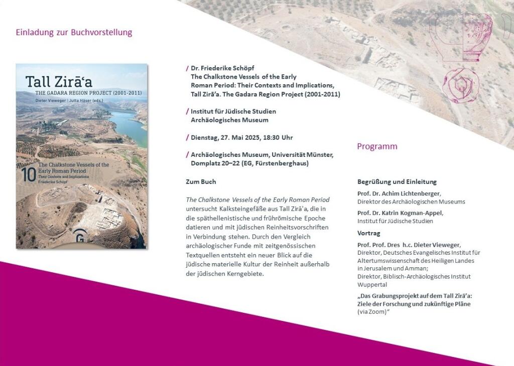 Einladung zur Buchvorstellung "Tall Zirā’a: The Chalkstone Vessels of the Early Roman Period"