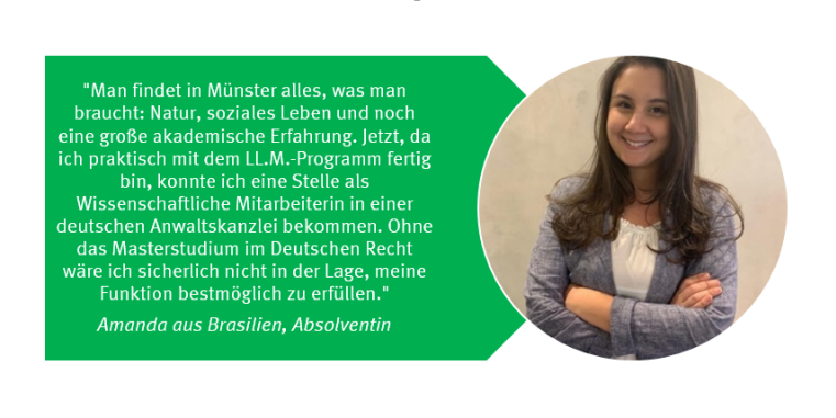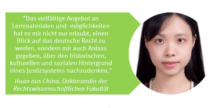 Im Ausland graduierte Juristen können an der Rechtswissenschaftlichen Fakultät den Masterstudiengang "Deutsches Recht" absolvieren. Der 1,5-jährige Studiengang vermittelt (partiell vertiefte) Grundkenntnisse im Deutschen Recht und qualifiziert seine Teilnehmer zu einem sicheren Umgang mit dessen Funktionsweise und Sprache. Das erworbene Verständnis von Kontext und Systematik befähigt zu einer eigenständigen weiteren Vertiefung. Der "LL.M." wappnet die Absolventen damit sowohl für eine Promotion in Deutschland, als auch für das Arbeiten an Fällen mit Bezügen zum Deutschen Recht.