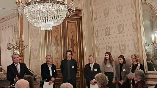 Zwei Wissenschaftlerinnen mit engen Bezügen nach Münster sind am 29. Januar 2026 in der deutschen Botschaft in Paris vom Präsidenten der Deutsch-Französischen Hochschule, Philippe Gréciano, mit Preisen für ihre juristischen Dissertationen ausgezeichnet worden. Thea Schlütermann (3. v. r.) hat den Dissertationspreis der deutsch-französischen Juristenvereinigung für ihre Studie „Die Ergänzung der repräsentativen Demokratie – eine Untersuchung anhand der französischen Convention Citoyenne pour le Climat“ erhalten. Die Arbeit ist an den juristischen Fakultäten in Münster und Toulouse entstanden. Sie wurde in Cotutelle gemeinsam betreut von Gernot Sydow und Aurore Gaillet, die regelmäßig auch in Münster lehrt. Die Arbeit von Thea Schlütermann untersucht, unter welchen Bedingungen ein Bürgerrat die tradierten Verfahren der parlamentarischen, repräsentativen Demokratie bereichern kann.