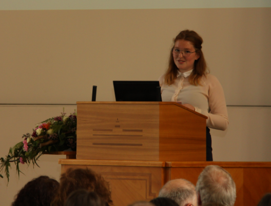 Sodann hieß Joy Dahmen, Vorsitzende der Fachschaft Jura, die Gäste herzlich willkommen. Sie gratulierte den Examinierten und wies darauf hin, dass alle Absolventen und Absolventinnen der Beweis dafür seien, dass das schwierige Examen zu schaffen ist, und sie damit Vorbilder für alle jüngeren Studierenden seien. Egal wie zufrieden sie persönlich mit ihren Noten seien, stolz können sie auf das Geleistete in jedem Fall sein. Sie riet ihnen, sich bei den anstehenden, möglicherweise sehr einschneidenden Entscheidungen nicht bloß vom Verstand, sondern zumindest auch vom Bauchgefühl leiten zu lassen.
