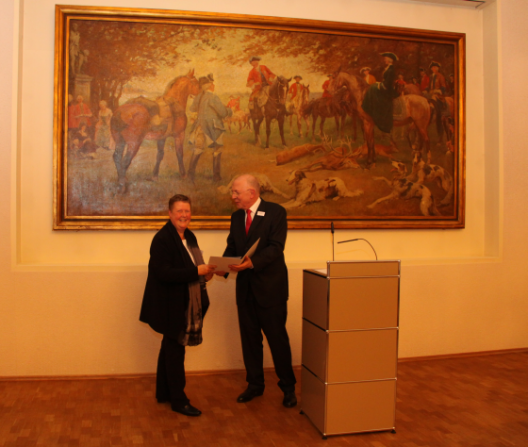 Nach der Hauptspeise ergriff Prof. Dr. Oebbecke erneut das Wort und es folgte die Verleihung der Honorarprofessur an Dr. Susan Grotefels und Dr. Jochen Bühling. Voraussetzung für die Verleihung dieses Titels sind hervorragende Leistungen in der beruflichen Praxis oder in der Forschung und Lehre. Dr. Grotefels ist seit 1991 Lehrbeauftragte an der Universität Münster und an der Fachhochschule für öffentliche Verwaltung Nordrhein- Westfalen. Seit 1996 ist sie außerdem Geschäftsführerin des Zentralinstituts für Raumplanung sowie Mitglied und Vizepräsidentin der Akademie für Raumforschung und Landesplanung (ARL). Nachdem in einem formalen Verfahren zwei Gutachten und ein Beschluss im Fachbereichsrat über die Verleihung des Titels gefasst wurden, trägt Dr. Grotefels nun den Titel „Honorarprofessorin“.