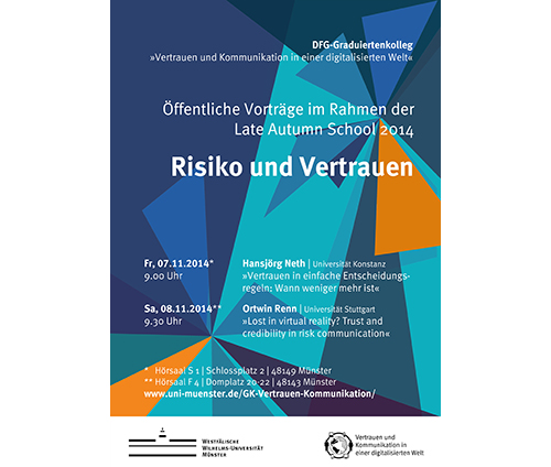 Den Auftakt zur Ringvorlesung des DFG-Graduiertenkollegs macht am Freitag, den 07.11.2014 um 9.00 Uhr s.t. (S1, Schloss) Dr. Hansjörg Neth von der Universität Konstanz mit einem Vortrag zum Thema „Vertrauen in einfache Entscheidungsregeln: Wann weniger mehr ist“. Dr. Neth beschäftigt sich im Rahmen der jährlich stattfindenden Late Autumn School des Graduiertenkollegs mit der Systematisierung der Beziehung zwischen Risiko und Vertrauen.