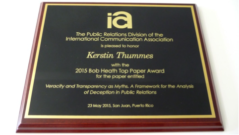 (09.06.2015) Für ihr Paper „Veracity and Transparency as Myths. A Framework for the Analysis of Deception in Public Relations“ hat Kerstin Thummes, Juniorprofessorin am Institut für Kommunikationswissenschaft, den Bob Heath Top Paper Award auf der im Mai 2015 abgehaltenen Jahreskonferenz der International Communication Association (ICA) in Puerto Rico verliehen bekommen.