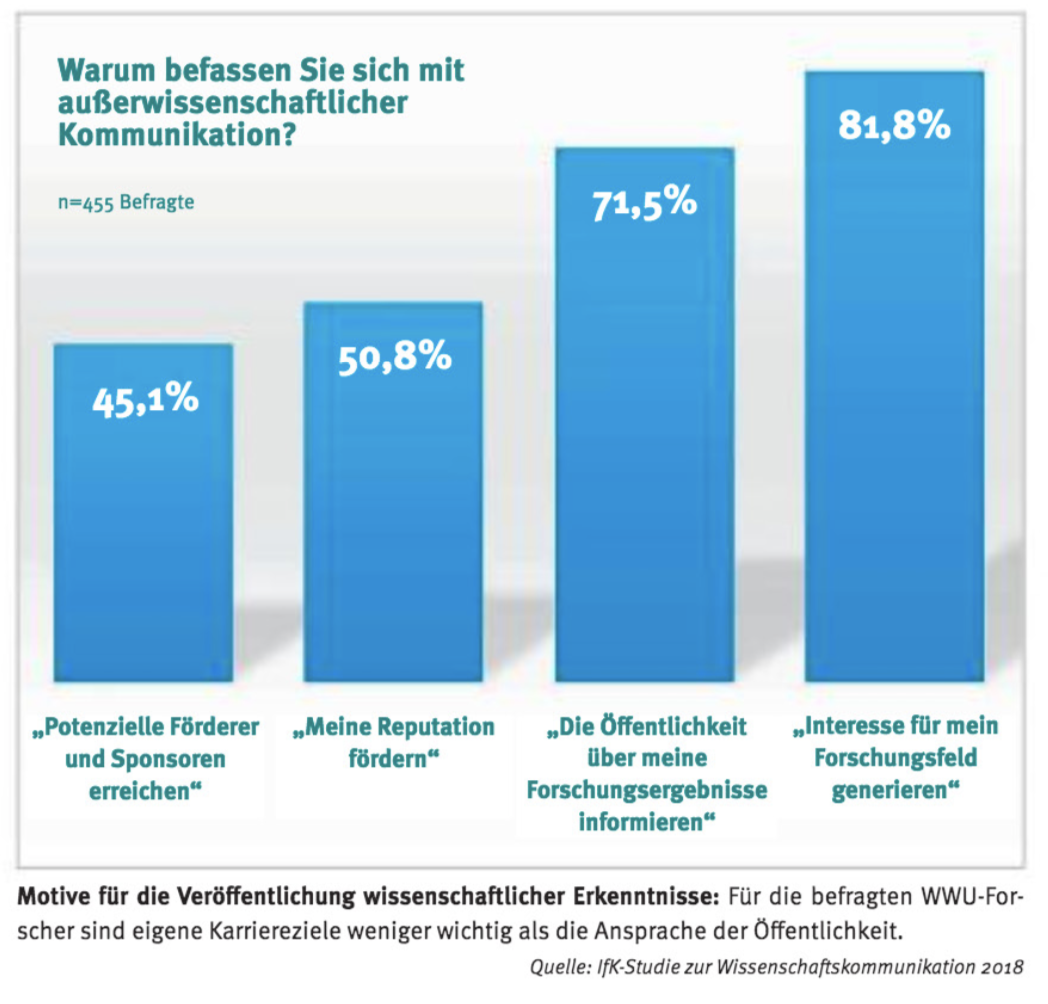 Dieser Befund ist insbesondere vor dem Hintergrund zu sehen, dass über die Hälfte der an der WWU arbeitenden Wissenschaftlerinnen und Wissenschaftler wahrnehmen, dass das gesellschaftliche Misstrauen gegenüber Wissenschaft eher wächst. Zwei Drittel sind der Ansicht, Wissenschaft sei zunehmend auf öffentliche Kommunikation angewiesen und 80 Prozent der Befragten stimmen der Aussage zu, dass sich Wissenschaftlerinnen und Wissenschaftler in Zukunft stärker an eine allgemeine Öffentlichkeit wenden müssen. Drei Viertel der Befragten wünschen sich zusätzlich Schulungen für die Medienarbeit.