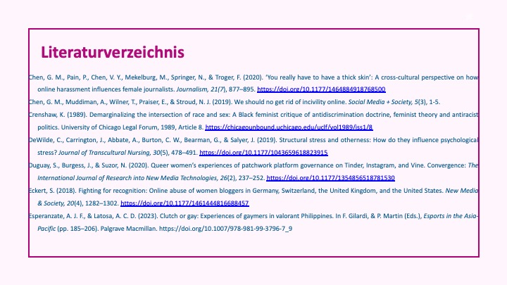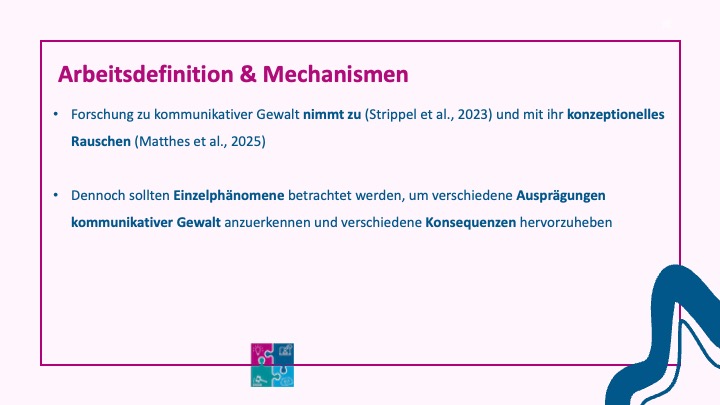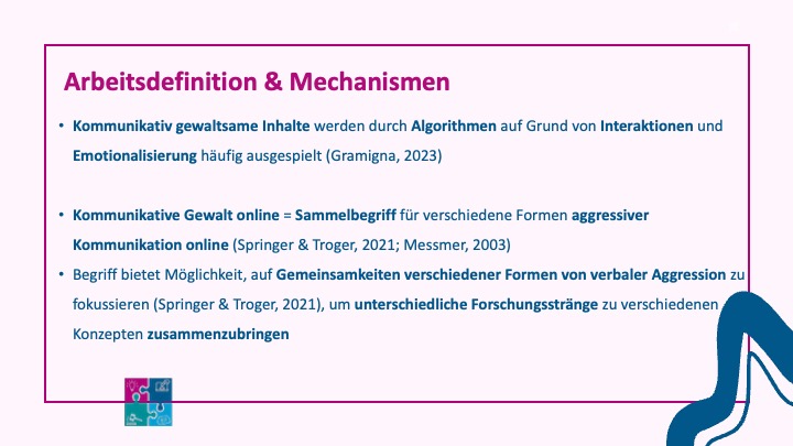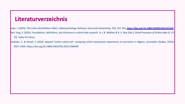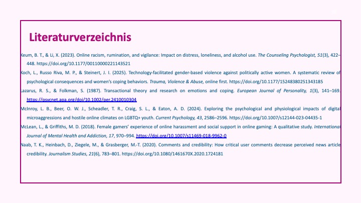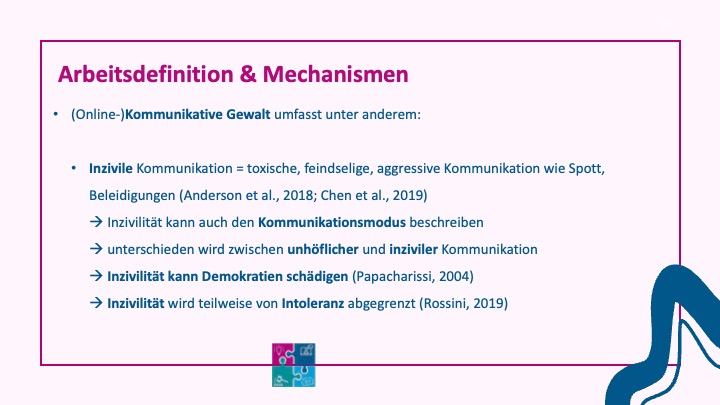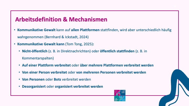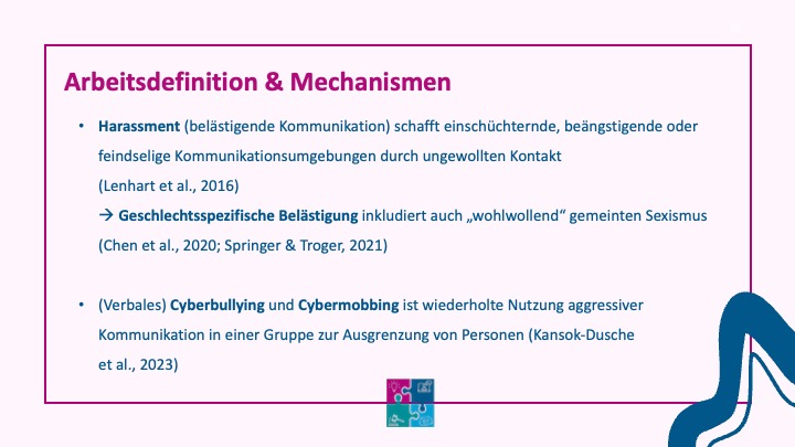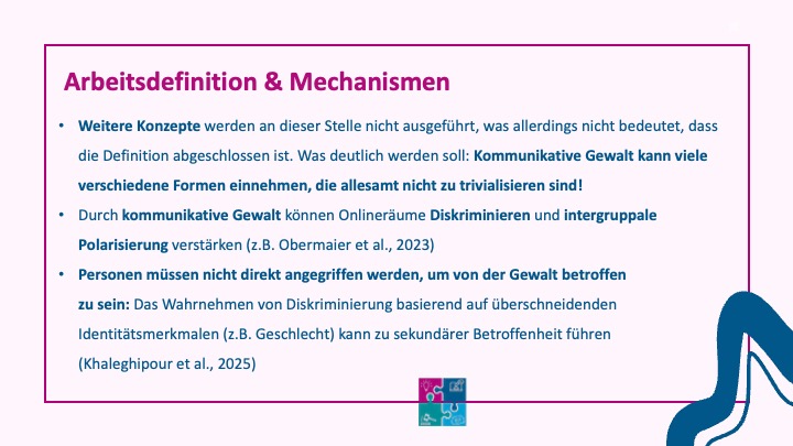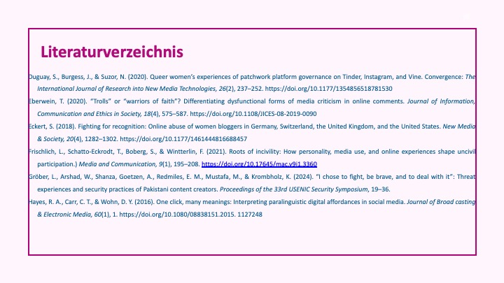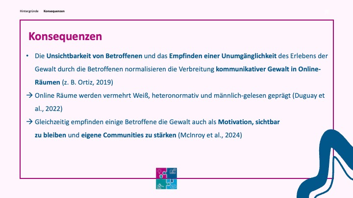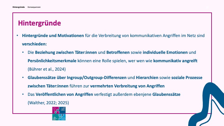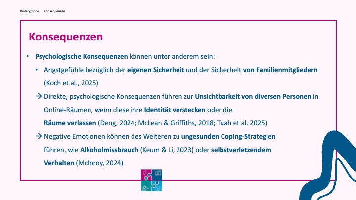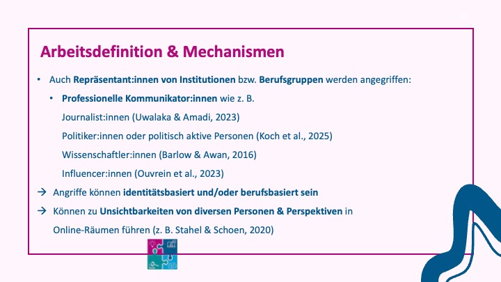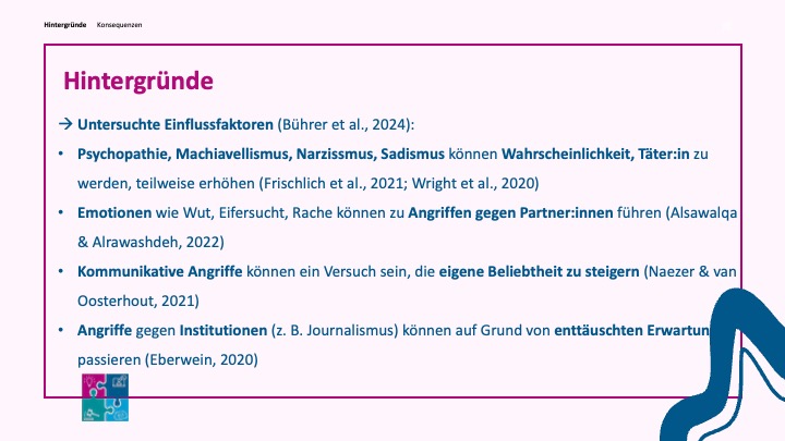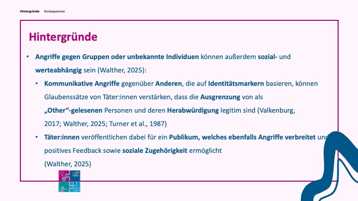 Wer online sichtbar ist, ist angreifbar. Die Gefahr von kommunikativen Angriffen im Netz durchzieht alle Gesellschaftsbereiche: Potenziell kann jede:r zur Zielscheibe von Hass, Trolling, oder Cyberstalking werden. Gerade für marginalisierte Gruppen erhöht eine bloße Präsenz im Netz die Gefahr, basierend auf verschiedenen Identitätsmarkern kommunikative Aggressionen zu erfahren (Khaleghipour et al., 2025).