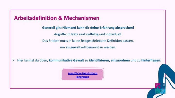 Hier findest du eine Slideshow zu Formen von kommunikativer Gewalt. Außerdem gibt es hier ein Arbeitsblatt, bei dem du das Gelernte anwendest, um zu üben, Angriffe im Netz kritisch einzuordnen.