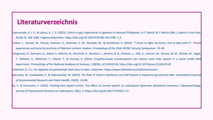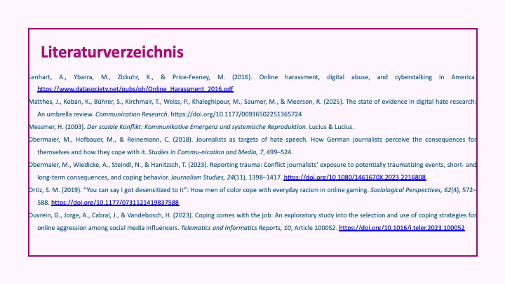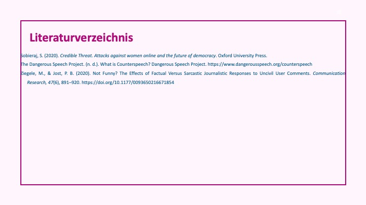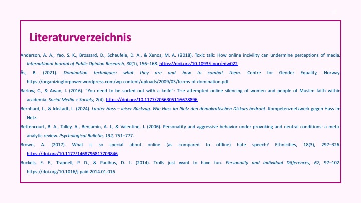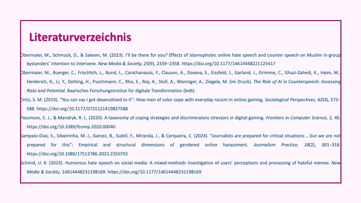 Seeger, C., Frischlich, L., Obermaier, M., Schmid, U. K., & Schulze, H. (2024). Hate-Speech und Angriffe auf Wissenschaftler*‘innen. Ein Forschungsüberblick. Transfer Unit Wissenschaftskommu-nikation. https://wissenschaft-im-dialog.de/documents/217/TransferUnit_Forschungsueberblick_Hatespeech.pdf