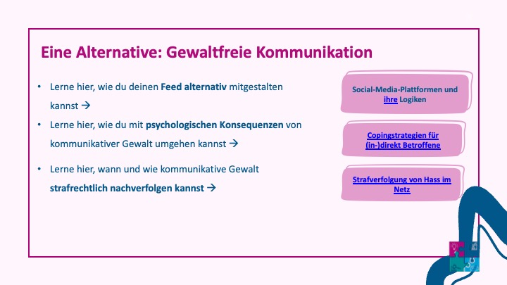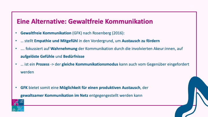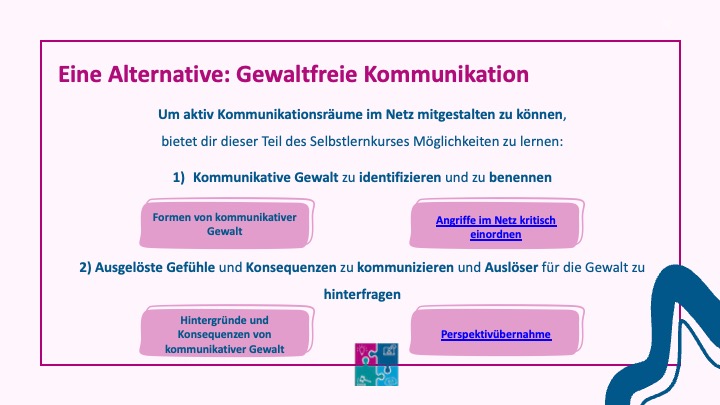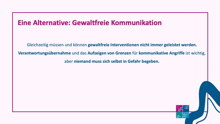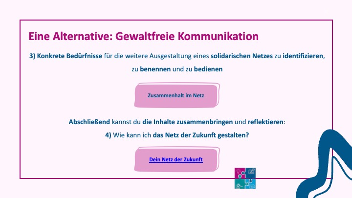 In diesem Teil des Selbstlernkurses findest du Materialien, die dir basierend auf den Prinzipien gewaltfreier Kommunikation (Rosenberg, 2016) dabei helfen, zu lernen, wie du dich aktiv gegen die Verbreitung von gewaltsamer Kommunikation positionierst. Du erfährst, wie du ein solidarisches Netz aktiv mitgestalten kannst.