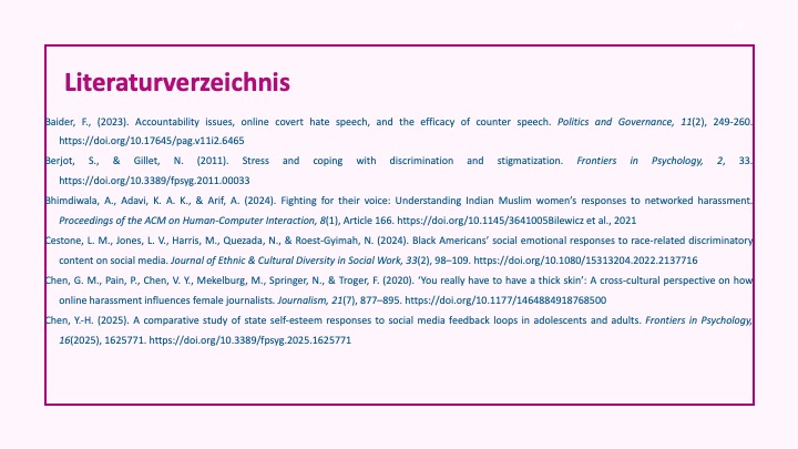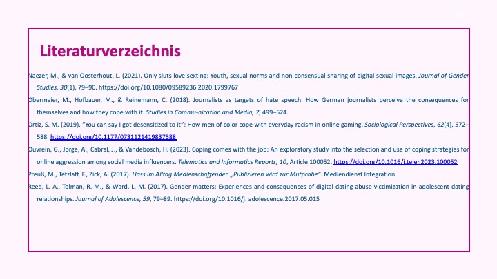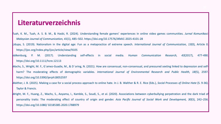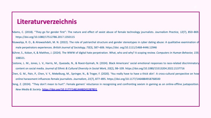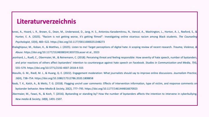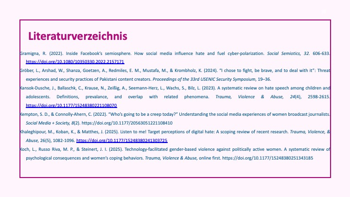 Khaleghipour, M., Koban, K., & Matthes, J. (2025). Listen to me! Target perceptions of digital hate: A scoping review of recent research. Trauma, Violence, & Abuse, 26(5), 1082-1096. https://doi.org/10.1177/15248380241303725