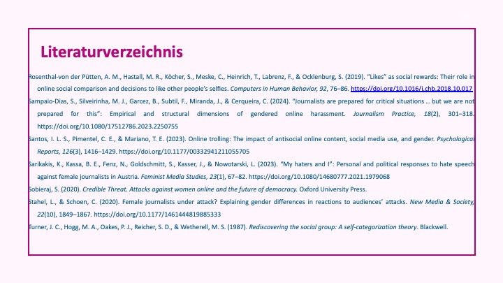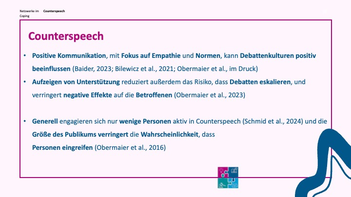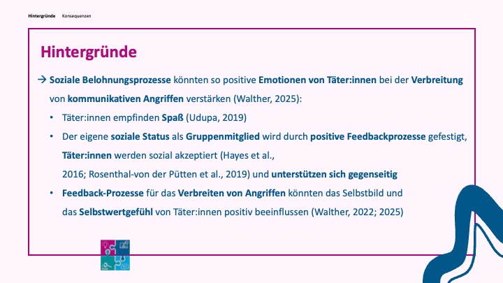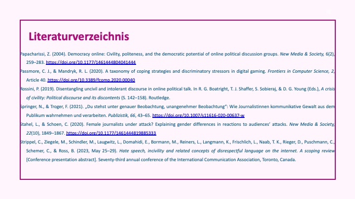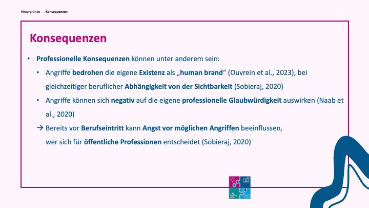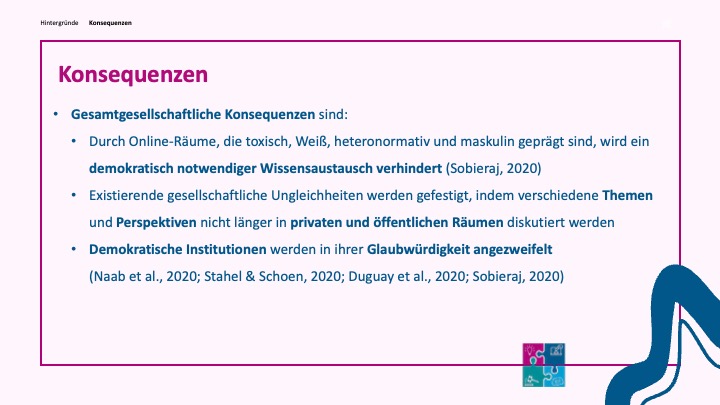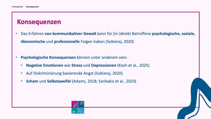 Die Angriffe haben vielfältige Konsequenzen: Sowohl direkt als auch indirekt Betroffene leiden unter emotionalen, professionellen, physischen und ökonomischen Folgen (Sobieraj, 2020). Hass im Netz schürt Feindbilder und schränkt Sicherheitswahrnehmungen ein. Der Pool an Menschen, die ein öffentliches Amt bekleiden oder öffentliche Aufgaben übernehmen können und wollen, wird kleiner und homogener. Existierende gesellschaftliche Machtstrukturen werden repliziert (z.B: Blätte et al., 2025; Seeger et al., 2024). Kommunikative Angriffe schränken also die freie Meinungsäußerung und Repräsentation in Onlineräumen ein und sind schädlich für unsere demokratische Gesellschaft.