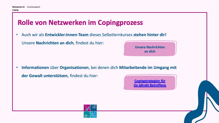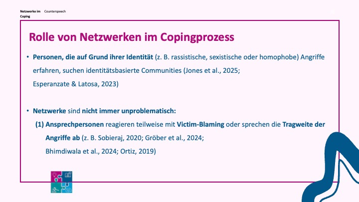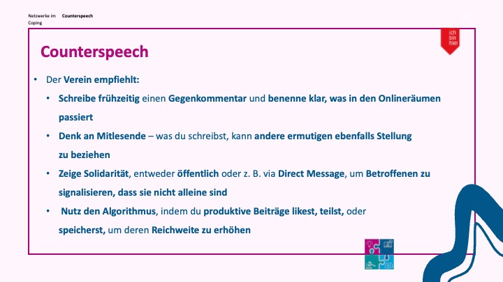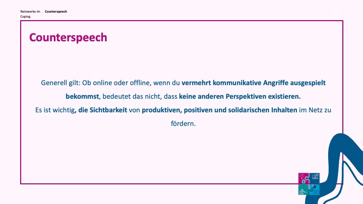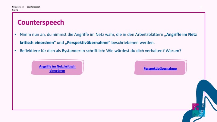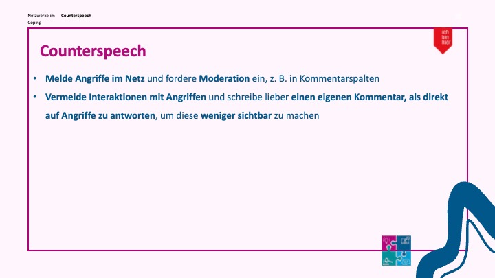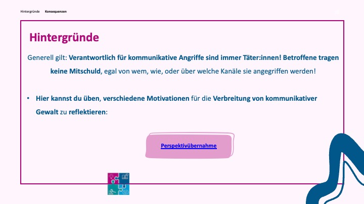 Du erfährst, wie wir im Netz Verantwortung füreinander übernehmen können und (in-)direkt Betroffene im Umgang mit den Angriffen unterstützen können.