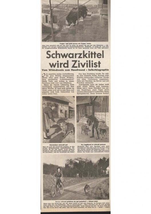 Auch in den 1950er Jahren sind Tiere nach wie vor ein Dauerthema der Hör Zu! Doch der weihevolle Ton ist verschwunden. Die Beiträge, in denen die Tiere häufig selbst ,zu Wort kommen‘, verbinden Heimat- und Domestikationssemantiken mit vorwiegend humoristischem Einschlag.[xii] „Schwarzkittel wird Zivilist“ ist der Titel einer Bildergeschichte von 1956. Mecki wird es gefreut haben: