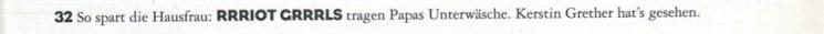 Obwohl die Recherche offenkundig die Lektüren der Riot Grrrls (Susan Faludis Backlash, Naomi Wolfs Beauty Myth, Sonic Youth) zutage gefördert hat, wird den jungen Frauen nicht recht zugetraut, sie auch verstanden zu haben, „Theorien haben sie nicht“. Überhaupt sind die Ziele und Anliegen der Bewegung, die zum Teil sicher zum Slogan taugen, oft aber auch in Manifesten und Lyrics ausformuliert sind, im Spiegel auf verkürzte Floskeln heruntergebrochen.[8] Auf die für die Bewegung so zentralen Faktoren „Mädchenpower und Solidarität“ wird nur am Rande eingegangen und auch die empowernden Foren der Bewegung abseits der Konzerte, also persönliche Treffen, Telefonketten und Zines zum Beispiel, finden kaum Erwähnung.