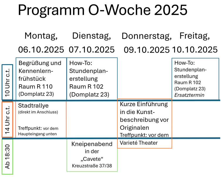 willkommen am Institut für Kunstgeschichte! Wir, die Fachschaft Kunstgeschichte, freuen uns, Euch im Rahmen der Orientierungswoche (kurz „O-Woche“) begrüßen zu dürfen. Sie bietet Euch die erste Gelegenheit, das Institut, die Stadt und einander kennenzulernen.
