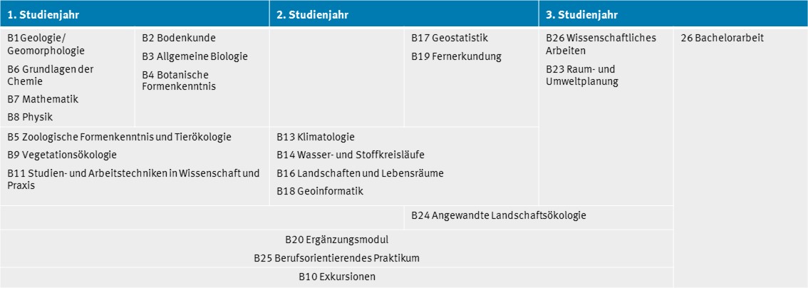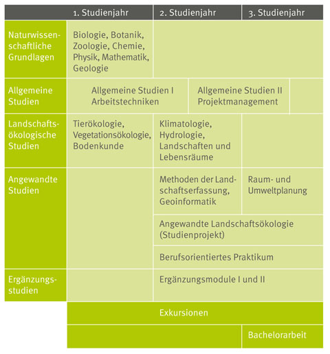 Im Fokus des Bachelor-Studiengangs steht die Vermittlung von grundlegenden Kenntnissen zur Analyse und Bewertung von Ökosystemen. Aus diesem Wissen werden praktische Anwendungen abgeleitet, die sich mit der nachhaltigen Nutzung und Entwicklung der Landschaft und ihrer Funktionen beschäftigen. Der B.Sc.-Studiengang ist modular aufgebaut und umfasst drei Studienjahre.