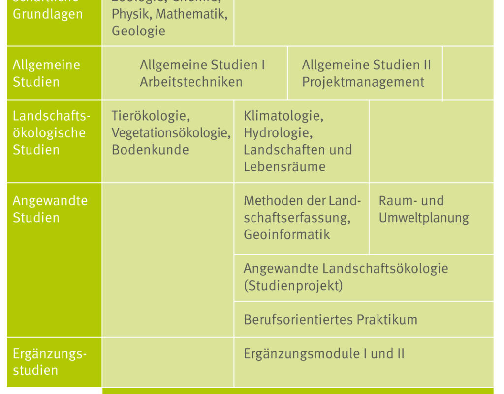 In den Landschaftsökologischen Studien werden in den Modulen Bodenkunde, Klimatologie, Hydrologie, Tier- und Vegetationsökologie sowie Landschaften und Lebensräume einführende und vertiefende Kenntnisse und Fähigkeiten zur Analyse der Ökosystemkompartimente und ihrer Beziehungen vermittelt. Die Studierenden üben die relevanten Methoden für Labor- und Geländearbeit und die selbständige Erfassung, Aufbereitung, Interpretation und Präsentation von Daten und Ergebnissen.