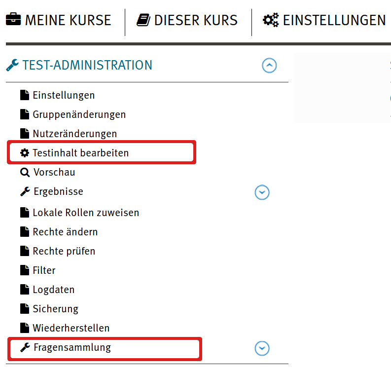 Nachdem die Rahmenbedingungen festgelegt wurden, kann der Testinhalt bearbeitet werden. Hierbei ist es essentiell den Unterschied zwischen den Menüpunkten Testinhalt bearbeiten und Fragensammlung zu verstehen.