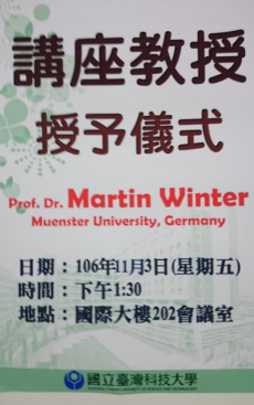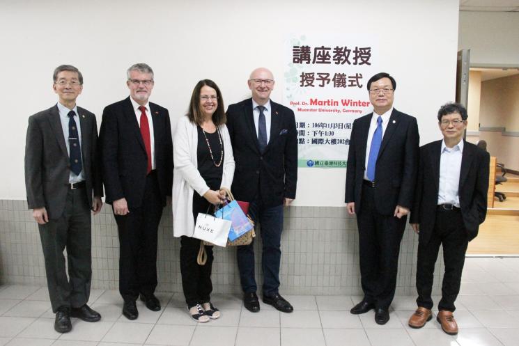 Um seine herausragenden akademischen Beiträge im Bereich der elektrochemischen Energiespeicherung und Energiewandlung zu würdigen, hat die National Taiwan Tech University of Science and Technology (NTUST), Taiwan Tech, Martin Winter zum Ehrenprofessor ernannt. Die feierliche Verleihung wurde durch den Präsidenten der NTUST Prof. Ching-Jong Liao im Beisein von Martin Eberts, Generaldirektor des Deutschen Instituts in Taipei, der deutschen Auslandsvertretung in Taiwan, vorgenommen.
