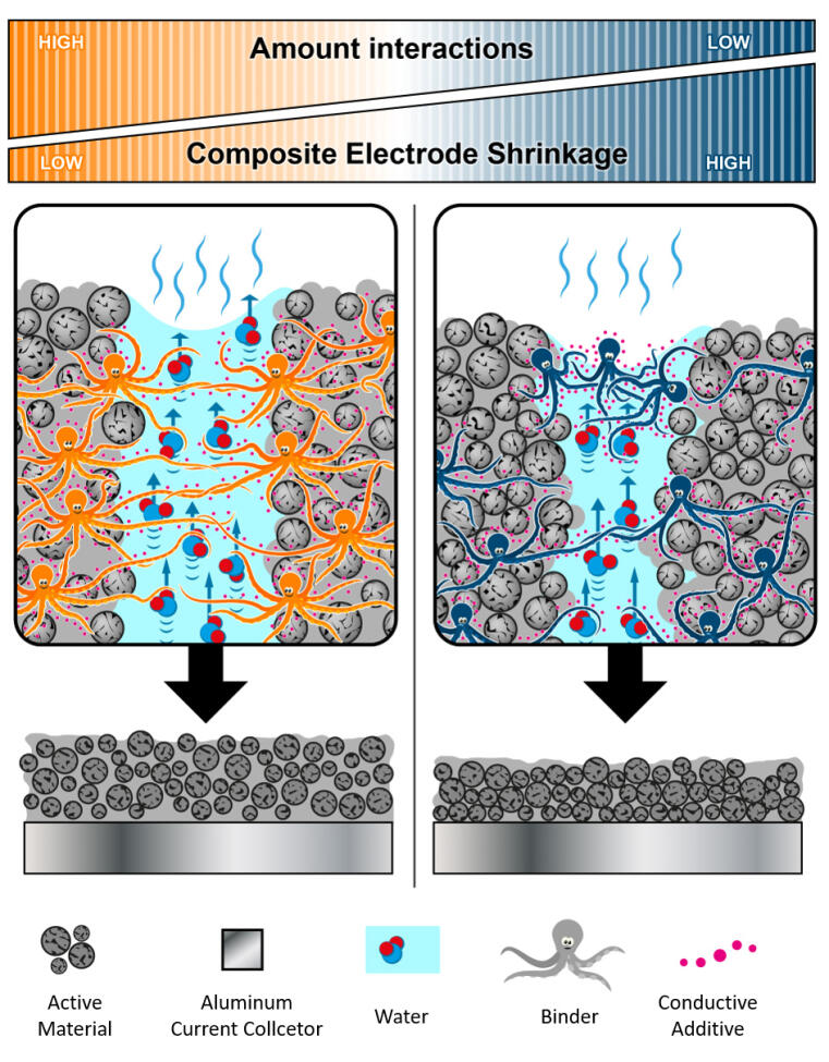 Ein Ansatz, um die Batterieproduktion umweltfreundlicher, kostengünstiger und energieeffizienter zu gestalten, ist das umweltschädliche Lösemittel N-Methyl-2-pyrrolidon (NMP) durch Wasser zu ersetzen. Möglich ist das nur in Kombination mit einem passgenauen, wasserlöslichen Binder. Carboxymethylcellulose (CMC) wird bereits vielfach in der Grafitanode von Lithium-Ionen-Batterien verwendet. Sein Einsatz in wässrig verarbeiteten, nickelreichen Hochenergie-Kathoden ist jedoch noch mit Herausforderungen verbunden. Ein Team des MEET Batterieforschungszentrums der Universität Münster hat deshalb untersucht, wie schon kleine Veränderungen in der chemischen Struktur von CMC den Herstellungsprozess und die Qualität der Kathoden beeinflussen.