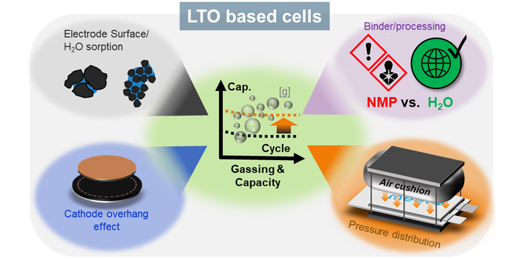 In einer vorherigen Studie identifizierten die Forschenden bereits einen Ansatz, um die Gasentwicklung nachhaltig einzudämmen. Hohe Temperaturen während des Formierungsprozesses sorgten dafür, dass sich eine stabile und gleichzeitig schützende Zersetzungsschicht auf der Oberfläche der LTO-Verbundelektrode bildete. Diese verhinderte erfolgreich die Gasentwicklung während der zyklischen Alterung, dem mehrfachen Laden und Entladen der Batterie, ohne die Performanz zu beeinträchtigen.