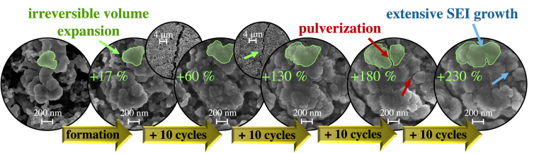 Bildgebende Verfahren wie Rasterelektronenmikroskopie (SEM) und energiedispersive Röntgenspektroskopie (EDX) sind gängige ex-situ-Methoden für die Post-mortem-Analyse von Batteriematerialien. Darüber hinaus bieten in-situ-/operando-Methoden – also Analysen während des Betriebs der Batteriezelle – genauere Einblicke. Die bisherigen Herausforderungen hierbei: Bei ex-situ-SEM Messungen können kleine Veränderungen der Partikel erst gar nicht beobachten werden und die Bilder sind oft schwer vergleichbar, da unterschiedlichen Elektroden und Stellen verglichen werden. In-situ-SEM Messungen ermöglichen detaillierte Einblicke, erfordern aber ein komplexes Analyse-Set-up und spezielle Elektrolyte, welche nicht die realen Bedingungen beim Laden und Entladen in konventionellen Zellen widerspiegeln. Dem Team um MEET Forscherin Iris Dienwiebel gelang es nun, diese bisherigen Herausforderungen zu überwinden: „Wir haben erstmalig Aspekte von in-situ- und ex-situ-SEM/EDX-Messungen kombiniert und eine neue Methode (quasi in-situ) entwickelt, die sehr detaillierte Einblicke in die Alterung von Elektroden in einem konventionellen Zell-Set-up mit einem Carbonat-basierten Elektrolyt ermöglicht“, erklärt die MEET Doktorandin. „Durch die Methode konnte für Siliziumnanopartikel-basierte Anoden gezeigt werden, dass die irreversible Volumenausdehnung gerade bei niedrigen C-Raten dominant ist, während die Pulverisation bei hohen C-Raten dominiert. Außerdem konnten wir zeigen, dass das Leitadditive eine entscheidende Rolle bei der Bildung einer homogenen SEI spielt.“